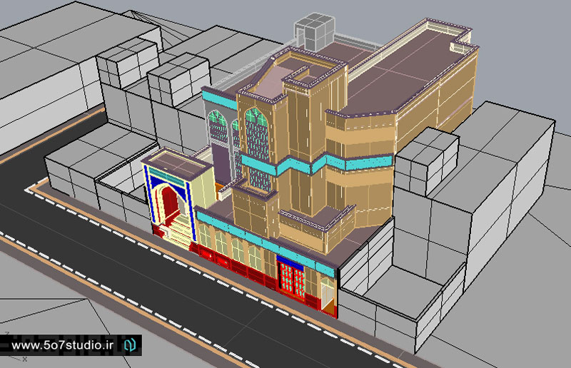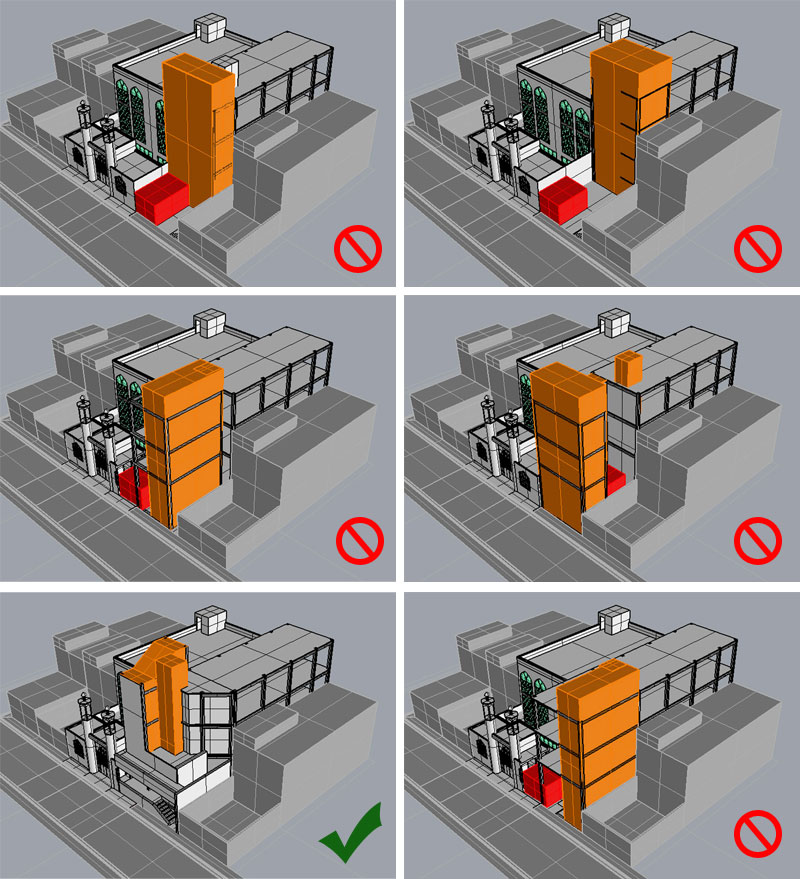 در این پروژه همانطور که قبلا اشاره کردیم، کارفرما به جز افزایش میزان فضای شبستان آقایان و خانمها خواستهی دیگری نداشت، اما همین خواسته هم چالش هایی برای ما در طراحی ایجاد میکرد. زمین اضافه شده به بنای اصلی مسجد ابعادی در حدود 21 متر طول و 6 متر عرض و مساحتی در حدود 126 متر مربع دارد. با یک حساب اولیه و با احتساب قانون 60 درصد پر و خالی زمین، میزان عرصهی قابل ساخت در حدود 75 متر مربع است که شامل مسیر حرکت قائم یعنی راه پله و آسانسور، پیش ورودی شبستان و نورگیر میباشد. بنابراین با کسر مجموع مسیرحرکت قائم و فضاهای جانبی این بنا، 45 متر مربع به فضای شبستان در هر طبقه اضافه میشود که به نظر ما بسیار ناچیز میباشد. ما به ناچار برای افزایش میزان فضا باید راه حل نوآورانهای ارائه بدهیم. راه حل ما بیرون کشیدن پلکان و آسانسور از بنا و قراردادن آن در فضای بیرون 60 درصد توده است. این کار به ما اجازه میدهد مساحتی در حدود 60 متر در هر طبقه به شبستان اضافه کنیم. البته ما نمیتوانیم در این پروژه قانون شهرداری را نادیده بگیرم، بنابراین با مشورتی که با مسئولین امور مساجد انجام دادیم مشخص شد قانونی مختص مساجد وجود دارد که در آن به طراحان اجازه میدهد در تراز همکف و زیرزمین به صورت کامل توده طراحی کند. پس ما در طراحی اجازه داریم در همکف به طبقهی اول پلکان و آسانسور را بیرون بکشیم. برای ما گزینههای مختلفی در نحوهی استقرار مسیر قائم نسبت به بنا وجود داشت که ما با توجه به عدم مسدودکردن نور همسایهی مجاور و بهینهترین مسیر گردش در بنا، گزینهی نهایی را انتخاب کردیم.