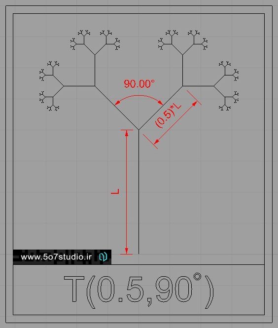 کارکرد این فرکتال به این صورت است که ابتدا خطی عمودی به طول L ترسیم میگردد و پس از آن دو شاخه به طول COE*L از سر خط اولیه ترسیم میشود که زاویه ی مابین دو شاخه Thetaدر نظر گرفته میشود. این روال در مراحل بعدی نیز به صورت بازگشتی و تا بینهایت اجرا میگردد. در اسکریپت زیر شرط خاتمهی این فرایند کوچکتر شدن طول شاخه از 0.1 واحد در نظر گرفته شده است.